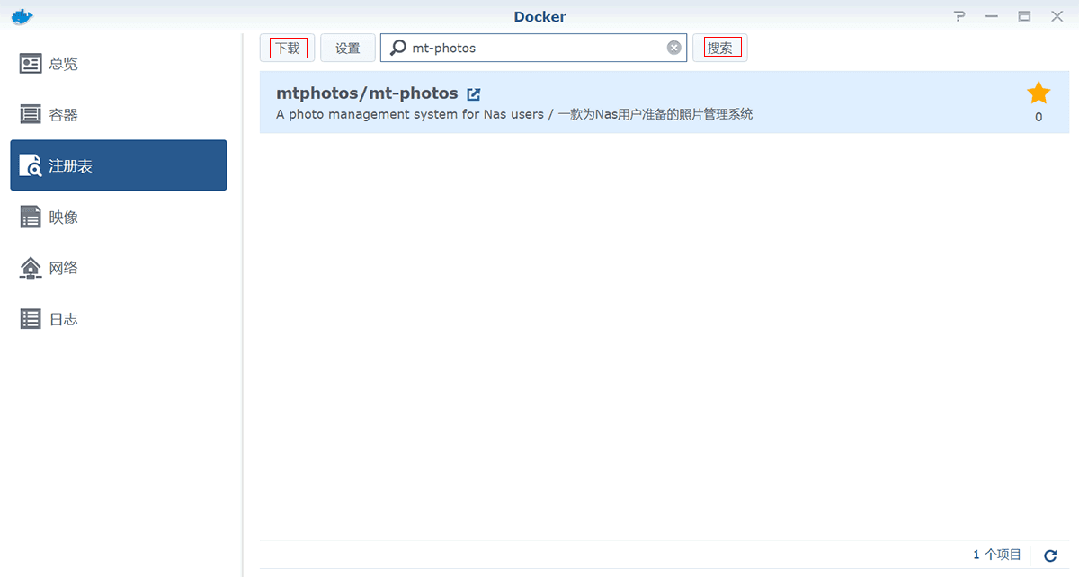 在搜索结果中点中mtphotos/mt-photos,然后点击【下载】;