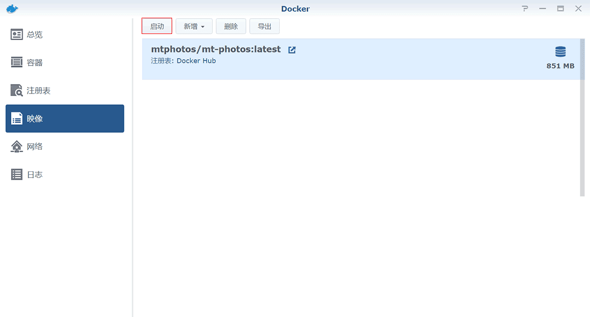 下载完成后,先点击 mtphotos/mt-photos:latest,然后点击【启动】来创建容器