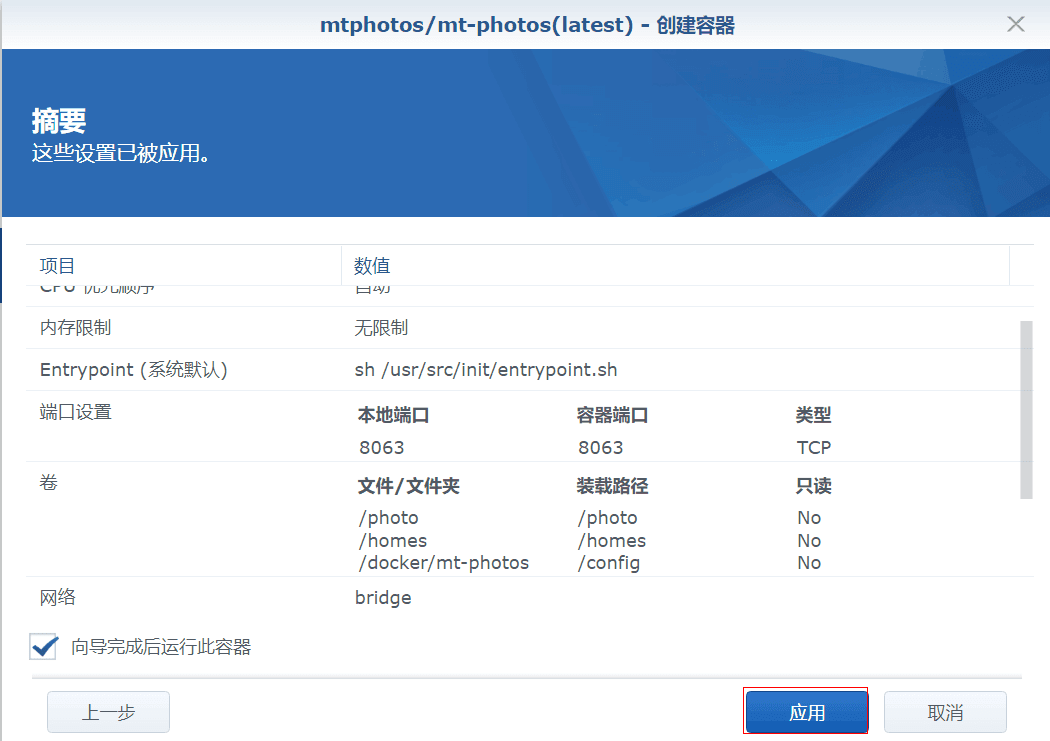 在最终的确认页面核对信息,然后点击【应用】创建容器; 确认已经勾上【向导完成后运行此容器】,否则需要到【容器】栏目下手动启动容器;