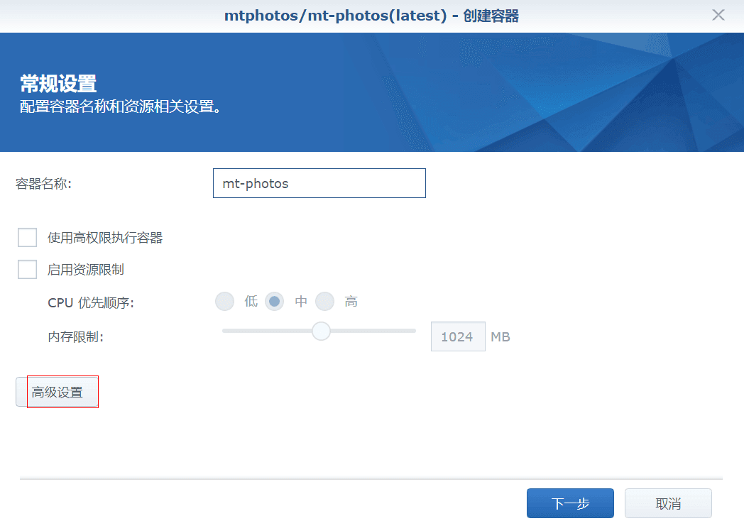 在弹出的窗口,修改容器名称,然后点击【高级设置】
