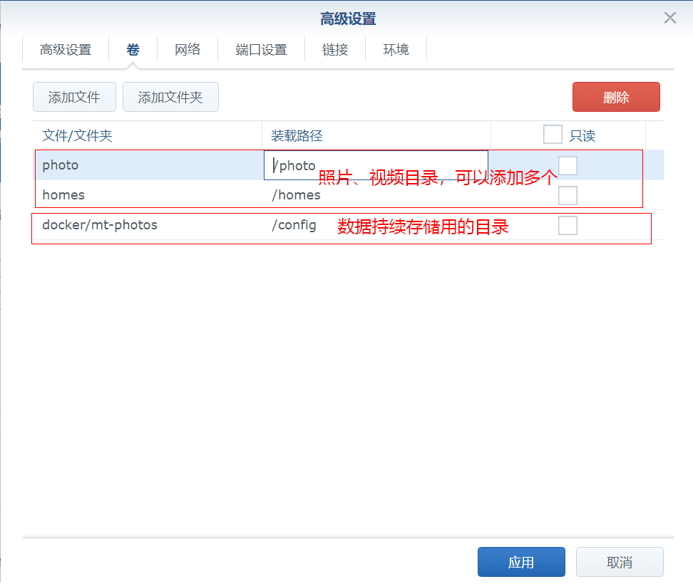 /config; /photo/homes映射到docker内的目录地址名称可以为任意名称;